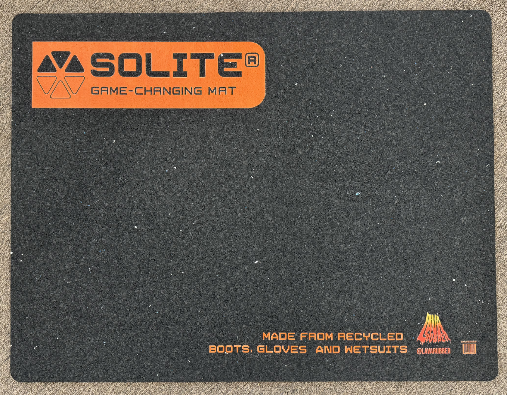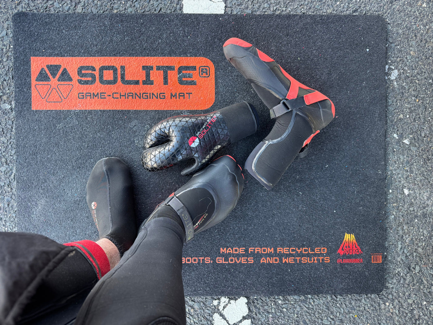 Game-Changing Mat! The Solite Lava Rubber Changing Matt is made with 100% recycled old wetsuits, boots, and gloves. Thanks to our friends at Lava Rubber, we can give new life to old gear in the form of these sweet changing mats. Mats are a comfy 1/4" thick to take the edge off rocky parking lots, and measure an ample 25"x 34" to keep your suit from spilling over the edge.